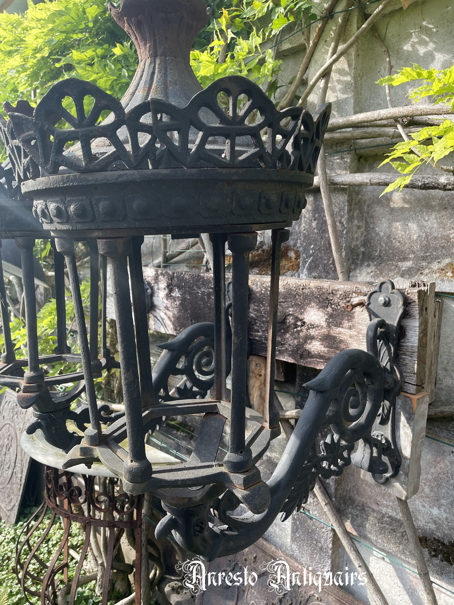 Oude gietijzeren tuinmuurlantaarns met muursteun.