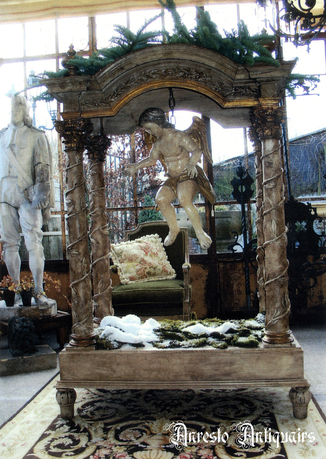 Antiek processie baldakijn. Volledig massief essenhout. Met 4 dragende zuilen. Barokstijl. Afkomstig uit een klooster uit Hasselt, namelijk: de Grauwzusters. Originele kleurpatine. 18de eeuw.