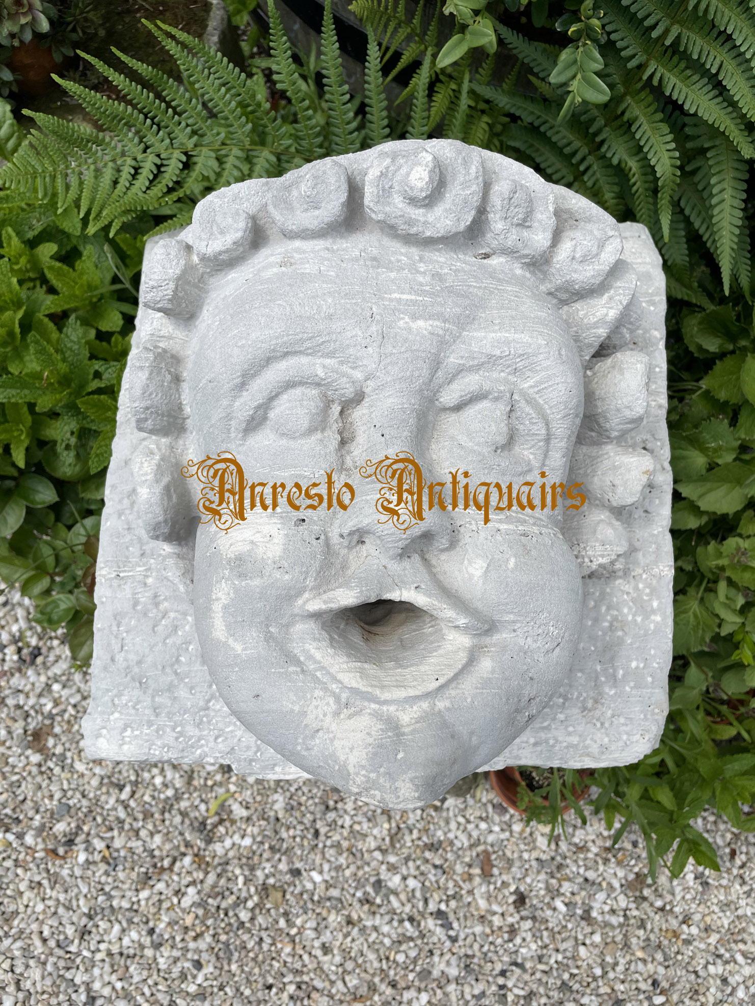 Antieke Bacchuskop. Antieke fonteinuitloop vervaardigd uit kalkzandsteen. Exclusieve stenen fonteinuitloop. 16de eeuw. Herkomst Italië. Afmetingen: hoogte: 35 cm / breedte: 35 cm.