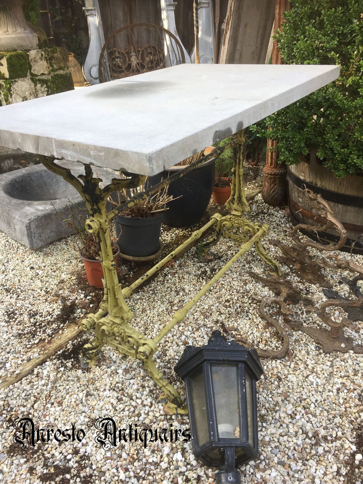 Kleine tuintafel met gietijzeren onderstel en blauwstenen blad. Periode: ± 1900. Franse herkomst. Afmetingen: lengte: 95 cm / breedte: 60 cm / hoogte: 76 cm.