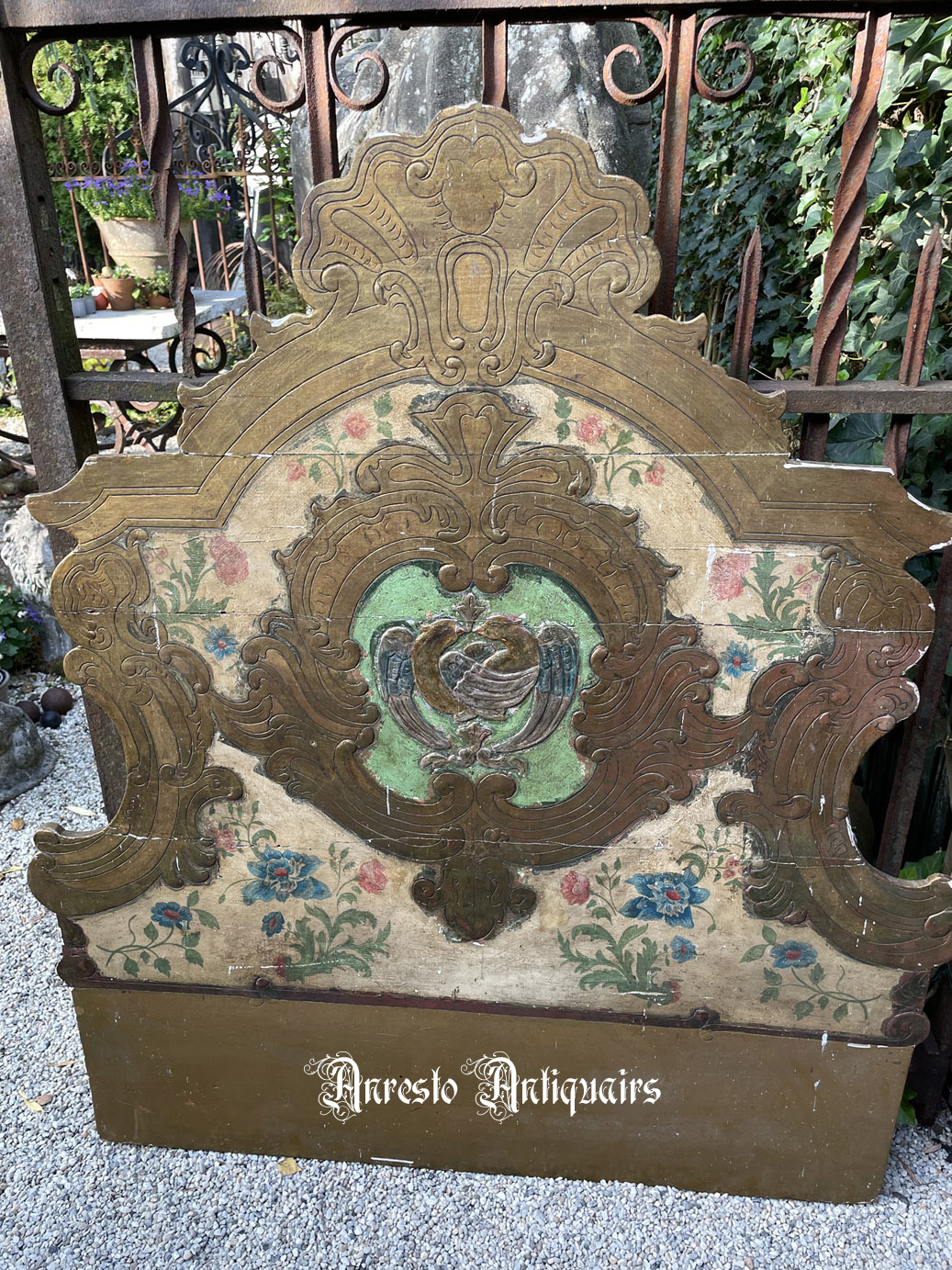 Gepatineerd en beschilderd afgewerkt met bloemen.