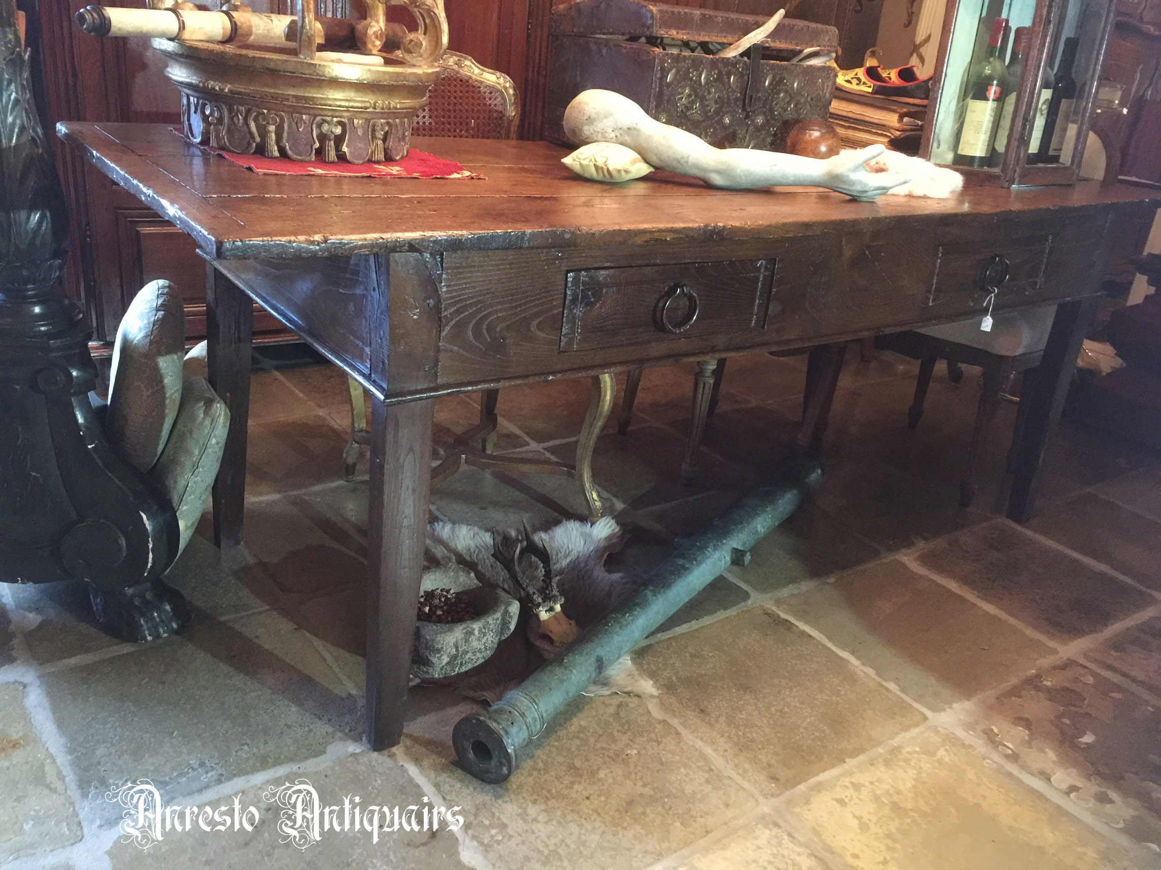 Antieke eikenhouten hoevetafel. Antieke landelijke hoevetafel. Landelijke stijl. 18de eeuws. Ardeense herkomst. Afmetingen: lengte: 2,10 m / breedte: 80 cm / hoogte: 78 cm.