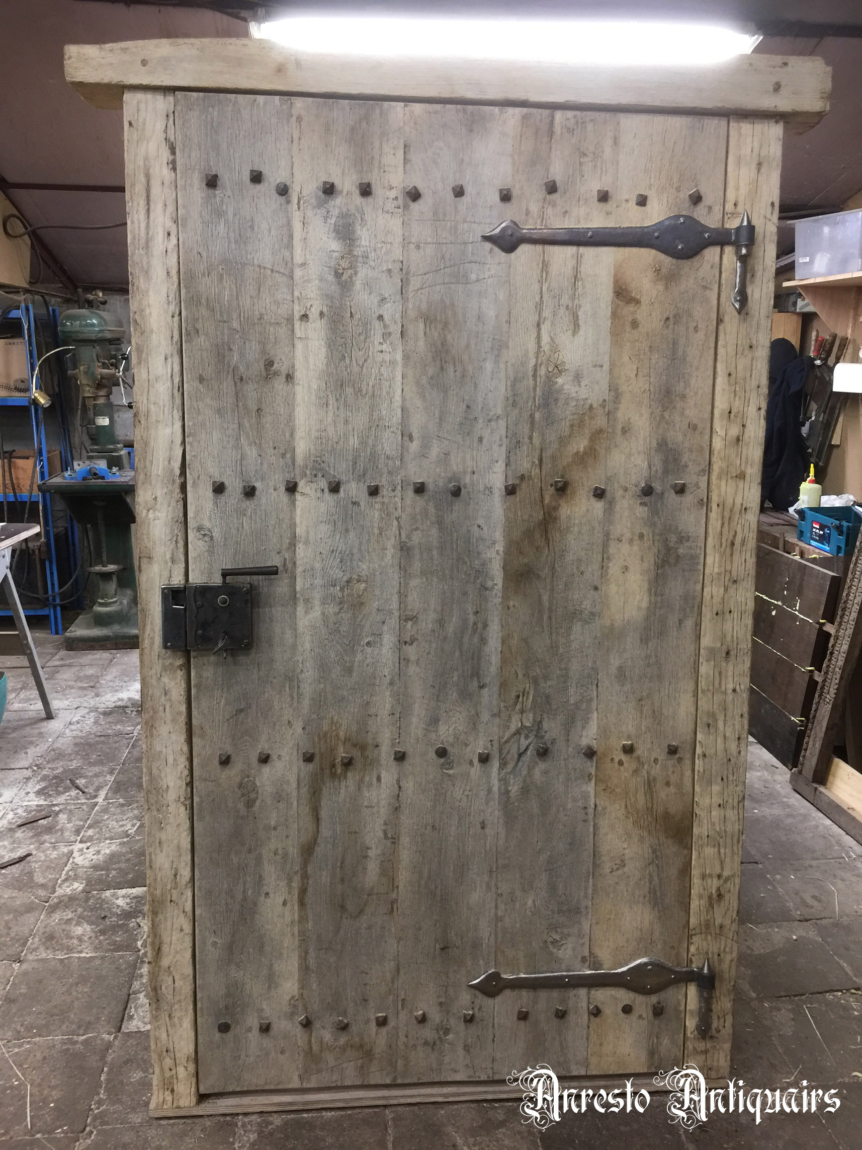 Landelijke houten hoevedeur met smeedijzeren benageling.